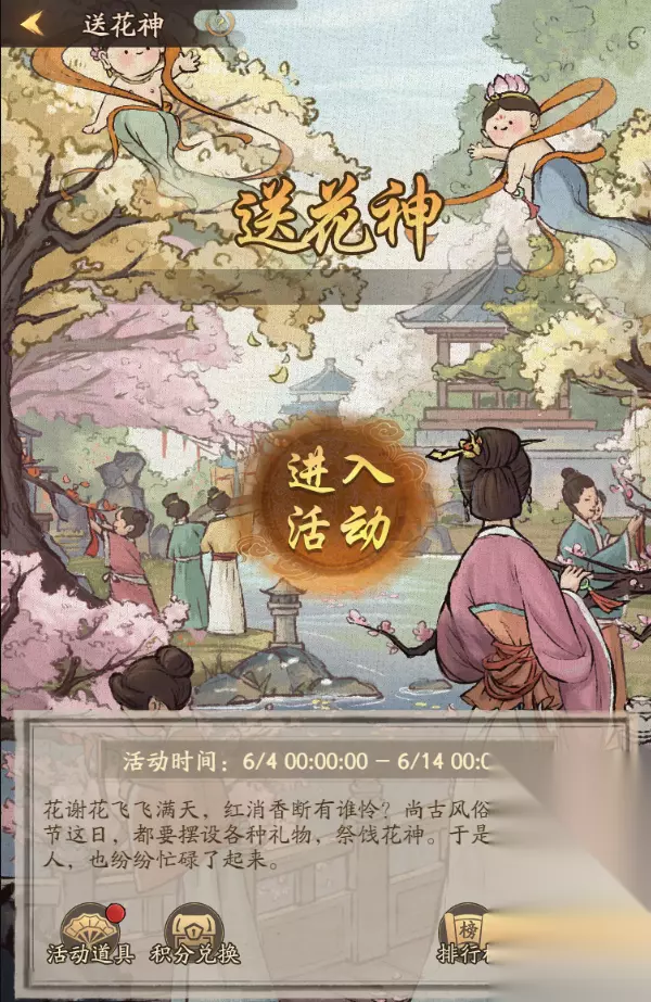 v 新增活动:送花神 1、使用不同活动道具可以参与送花神,并获得活动积分和奖励道具。 2、排行榜奖励分为个人榜和商会榜,排行榜奖励需要手动领取,无邮件补发。 3、未使用道具会在活动结束后自动转换为积分,积分不计入排行。