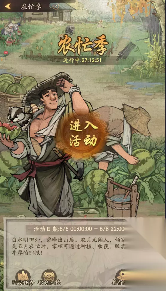 v 新增活动:农忙季 1、新增门客服装【郑果农-种瓜得瓜】,【苏武-躬耕之乐】 2、当掌柜身份达到10级时即可参与农忙季玩法 3、活动期间掌柜可以通过在土地上种下水果种子,待水果成熟以后获得活动积分,将成熟的水果在活动集市中卖出还可以获得水果币 4、活动时间为每日10点到22点,掌柜可在期间完成种植水果,收获水果,帮亲友果苗浇水,偷水果等操作,但不在活动时间内这些操作都将无法进行 5、水果种子:活动中有草莓、甘蔗、凤梨、西瓜四种种子,每一种种子的售价不同,培育时间不同,成熟后的果实售价也不同,掌柜可在活动中快捷窗口购买种子,种子购买次数将在每日0点重置(未使用的种子在活动结束以后将自动转化为水果币) 6、水果施肥:掌柜可以使用肥料来缩短水果的成熟时间,(活动结束未使用的肥料将转化为水果币) 7、水果收获:成熟并收获水果可以获得一定的活动积分,积分可以提升掌柜的果园等级,解锁等级将领取服装【郑果农-种瓜得瓜】,【苏武-躬耕之乐】等丰厚奖励 8、亲友互助:掌柜每日可以帮亲友在开花状态的果苗浇水,一株果苗只能浇水一次,浇水可以增加果苗的产量,每日的帮助和被帮助总次数有限,次数将在0点重置 9、偷水果:掌柜可以前往偷取非亲友掌柜已成熟的水果,但每日偷取的次数有限,次数将在0点重置 10、兑换商店:掌柜通过售卖已成熟的水果将会获得水果币,水果币可用于兑换道具,每日0点重置道具兑换次数;活动结束后,未兑换的积分将保留并可在下次活动开启时继续兑换。 11、排行榜:积分计入排行榜并为掌柜赢取排行奖励。奖励需手动领取,活动结束后未领取的奖励不予补发,望掌柜们悉知。