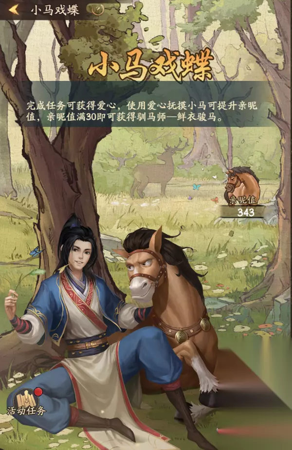 v 新增活动:小马戏蝶 1、新增门客服装【驯马师- 鲜衣骏马】。 2、参与活动消耗道具【爱心】进行抚摸,可以提升亲昵值并获得奖励,达到一定亲昵值可以领取【驯马师- 鲜衣骏马】服装。 3、每日将解锁不同的活动任务,完成相应任务可以获得【爱心】。 4、活动结束后未领取的亲昵值档位奖励将通过邮件发放。 5、未使用的爱心过期将会清空。