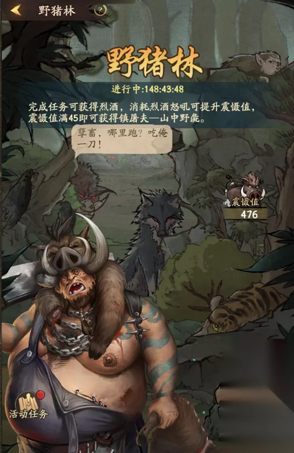 v 新增活动:野猪林 1、掌柜可在活动期间内,通过怒吼来提升震慑值,领取相应的奖励 2、怒吼详情: ①每次怒吼需要消耗烈酒,未使用的烈酒将在活动结束后清空 ②掌柜可通过完成活动任务和其他活动获取烈酒 ③完成度达到条件,可以领取对应档次的奖励。 3、活动任务: ①活动期间内,每日将解锁不同的任务 ②完成对应活动任务可获得对应奖励