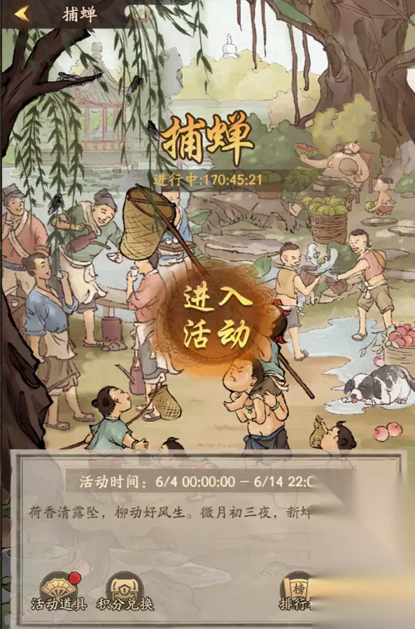 v 新增活动:捕蝉 1、使用不同活动道具可以参与捕蝉,并获得活动积分和奖励道具(用于升级门客百业经验) 2、排行榜奖励分为个人榜和商会榜,排行榜奖励需要手动领取,无邮件补发 3、未使用道具会在活动结束后自动转换为积分,积分不计入排行