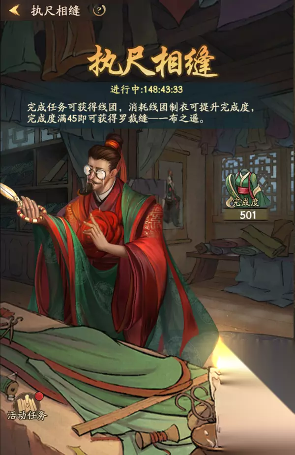 v 新增活动:咫尺相逢 1、掌柜可在活动期间内,通过制衣来提升完成度,领取相应的奖励 2、制衣详情: ①每次制衣需要消耗线团,未使用的线团将在活动结束后清空 ②掌柜可通过完成活动任务和其他活动获取线团 ③完成度达到条件,可以领取对应档次的奖励 3、活动任务: ①活动期间内,每日将解锁不同的任务 ②完成对应活动任务可获得对应奖励