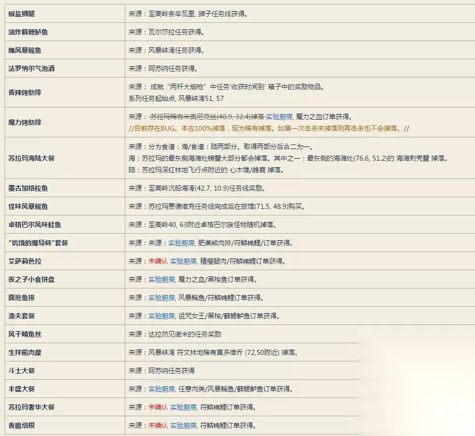 本贴只为达成“军团菜谱”成就。 烹饪食谱共21种,成就只需要做其中的15种。 除了任务/购买/掉落获得的食谱,其他食谱皆通过在诺米实验厨房下订单获得。 想获得某食谱的升级食谱当然是要下对应原材料的订单。 本表格中默认除苏拉玛外全地图故事线成就皆已完成。故事线任务中获得的食谱不再表明具体任务起始。 标记“未确认”的为引自wowhead中玩家留言。
