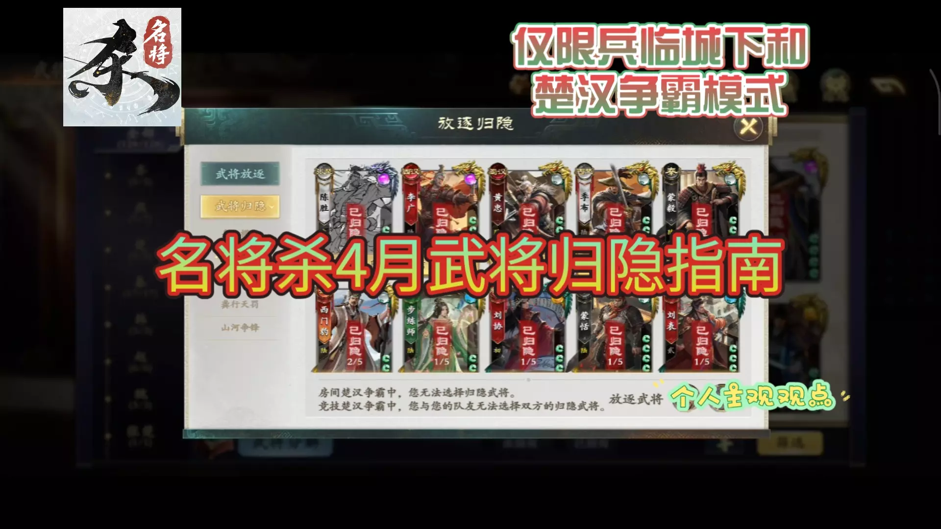 这是一篇《名将杀》2V2模式的全武将归隐建议帖,分享了不同阵营武将的归隐选择,比如建议归隐卢莫愁、秦舞阳、侯赢、巴清等武将,帮助玩家合理进行武将归隐操作,避免盲目选择。