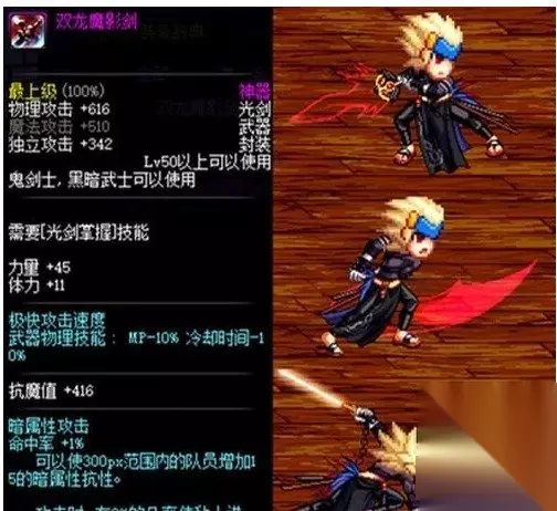 双龙魔影剑在60版本是剑魂玩家的信仰,被被玩家们俗称为黑光。其实黑光本来的外形不是图中这个样子的,原先剑身是通体发黑的,国庆版本更新后不知道为什么黑光的剑身颜色变透明了,不仔细看的话只看到剑柄的样子。以其说是无影剑,不如说是魔影剑更适合,毕竟只有暗红色的剑身外轮廓显使它变得更为妙不可言了。 DNF2020活动 欲望之塔