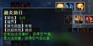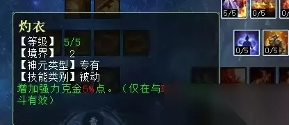 可以说,四项仙法的天赋技能设计理念大致相同,火法天赋的选择和风法天赋原理也差不多。任务玩家建议首选“金缕衣”和“百折不屈”。PK玩家建议首选“金缕衣”和“融炎助日”。因为,除非任务玩家天赋至少达到81点,否则点“融炎助日”完全无用。 火天赋第二排 火天赋第二排三个技能,分别是:灼衣(PK专用,增加强力克金),烟炎张天(任务、PK通用,增加火法狂暴几率),聚炎破体(任务、PK通用,火法五法秒时无视主目标5%比例的抗性)