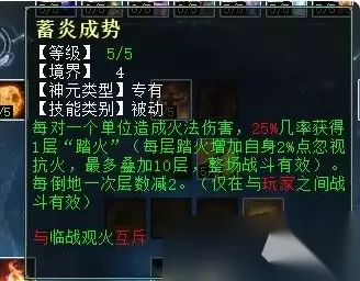 “洪炉点雪”是火法特有技能,如果你的装备是按吃天谴符战斗狂暴几率100%来做的,这个技能不用点,若PK中,火法狂暴几率不足100,那可以点上这个技能。要用这个技能,“修魂固魄”就得放弃,因为“聚炎入魄”为必点技能。 火天赋第四排 火天赋第四排同样有四个技能,后面两个技能互斥,只能选其中一个,它们分别是:凝神入魄(任务、PK通用,使用任意仙法五法秒,都可对主目标无视对应抗性),丹凤朝阳(PK专用,对被控的单位增加火法伤害),临战观火(PK专用,每回合开始前几率获得1层“踏火”状态),蓄炎成势(PK专用,火法秒到的单位越多,获得越多“踏火”层数,每倒地一次减2层)