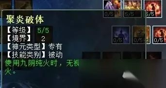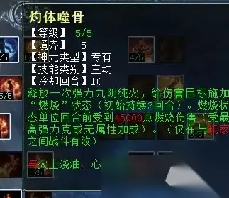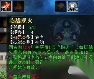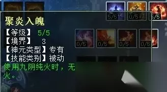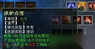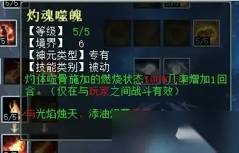 讲风法的时候,有小伙伴留言提到“焚风破体”在任务中没用,其实我们可以看下截图中技能的描述——“无视主目标5%比例的抗性”,这是什么意思呢?就是说,它并不像我们装备上的忽视属性那样——你抗,我忽视秒的多; 你不抗,我忽视一样有伤害加成。而这个无视比例抗性,就一定要作用在有抗的单位身上才有效,如果任务怪完全不抗风,那这个技能肯定就不会生效啦!这个原理适用于风、火、水、雷同类天赋技能。 这一排同风法一样,任务和PK玩家都可选“烟炎张天”和“聚炎破体”,因为灼衣增加的克金实在太少,不如后两项实惠。 火天赋第三排 火天赋第三排三个技能,分别是:修魂固魄(任务、PK通用,在战斗中提高人法抗性),洪炉点雪(PK专用,对火法没秒死的单位下回合增加火法狂暴几率),聚炎入魄(任务、PK通用,火法五法秒时无视主目标5%比例的抗性)
