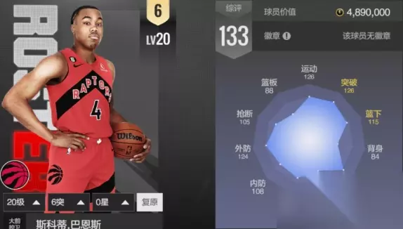 1.首发PG:斯科蒂-巴恩斯(身价489w) 巴恩斯作为标准的小前锋身材,游戏内却有着PG位置,那自然不能浪费,得放在首发控卫上,中投133,在中距离有着不错的稳定投射,突破上篮、运动、内外防守、控传都非常在线,可以这么说,目前价格这么低主要还是巴恩斯的外线三分不稳定跟投篮包较差导致的,这俩也是他目前在游戏内最大的缺点,如果新赛季三分效率足够稳定,那么他外线加强之后的实用性还能更大。 2.首发SG:RJ-巴雷特(身价135w) 大狙在游戏中的突破能力非常突出,中投122、三分118,双投虽然没有点亮,但是靠着不错的投篮包准度还凑合,外防、控传、防守板、运动等数值也够用,目前身价可以说是性价比非常高。 3.首发SF:布兰登-英格拉姆(身价500w) 莺歌是一个投射能力比较出众兼具些许背身得分的球员,中投142、三分124,投篮包偏慢,不过好在有4枚铜投射徽章加持,外线空位准度在线,控球133,进攻方面还可以自己持球打,不过唯一诟病的就是他的速度,作为锋线来说属于慢的水平。 4.首发PF:桑德罗-马穆拉什维利(身价30w) 206cm的马穆作为现代标准尺寸的空间型大前锋,在游戏的模型尚可,三分虽然在最近更新中被砍,只有122,没有点亮,但是在外线依旧能有些许威慑力,并且在夏天的欧锦赛以及季前赛中,马穆都延续着非常良好的手感,相信新赛季在猛龙获得更多机会的他能够把足够的上场时间转换为数据。