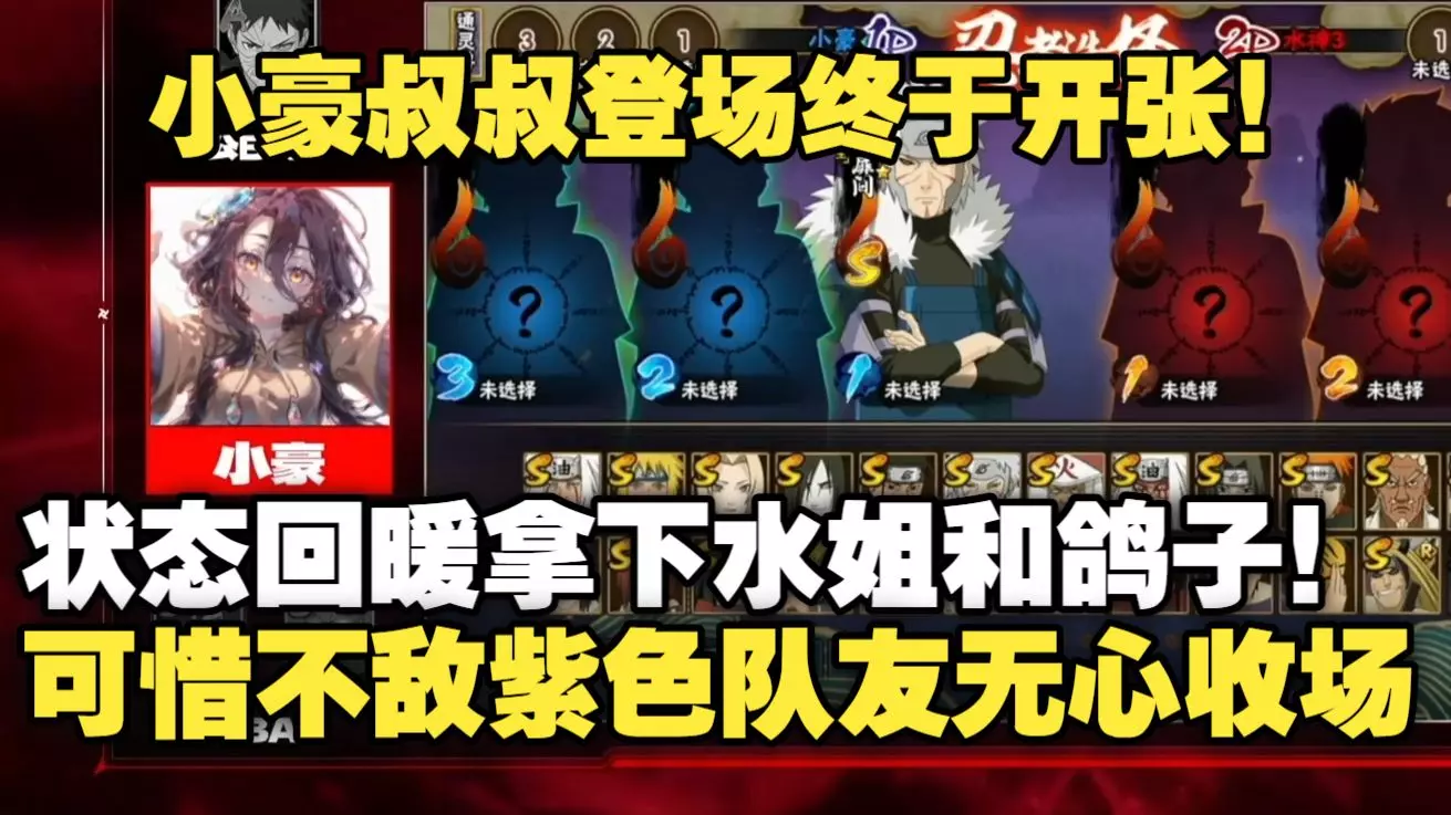 火影忍者手游玩家小豪开启无畏模式,采用全随机阵容,在决斗场逆版本挑战,冲击暗部到超影2800分的段位,过程中使用了仙人自来也、新春宇智波鼬等多样忍者对战。