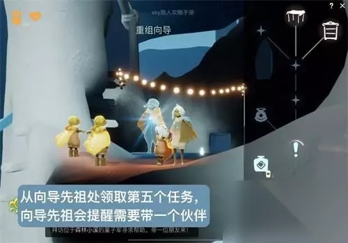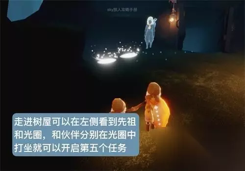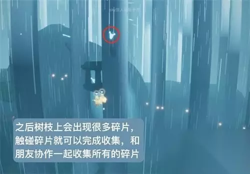 走进树屋可以在左侧看到先祖和光圈,和伙伴分别在光圈中打坐就可以开启第五个任务 之后树枝上会出现很多碎片,触碰碎片就可以完成收集,和朋友协作一起收集所有的碎片 全部收集完以后提交所有零件即可完成任务