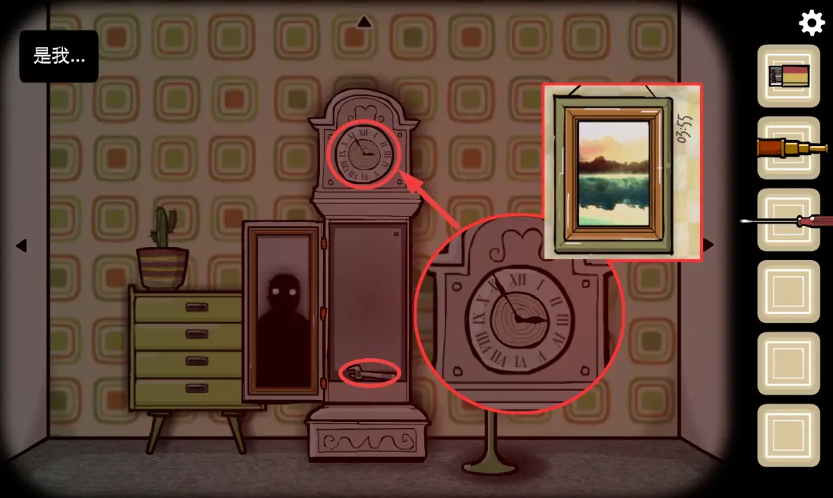 根据冬天厨房墙上挂着的,和夏天有关的照片旁的时间调整落地钟的时间到3.55打开落地钟柜门,获得(扳手)。