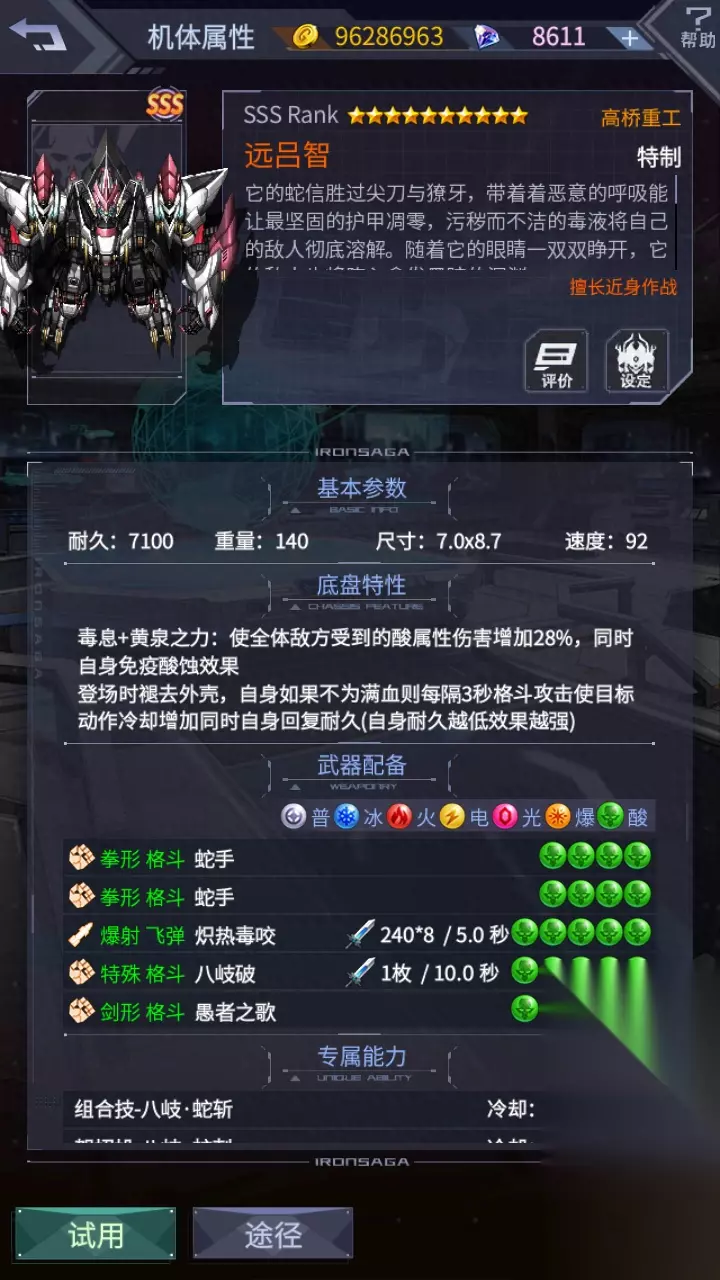 我们先来看下描述:【远吕智】:它的蛇信胜过尖刀与獠牙,带着恶意的呼吸能让最坚固的护甲凋零,污秽而不洁的毒液将自己的敌人彻底溶解。随着它的眼睛一双双睁开,它的敌人也将堕入愈发黑暗的深渊。 传说中的大蛇让无数人葬身蛇腹,但侥幸战胜它的人在剖开蛇腹后才终于发现,喷涌出的鲜血,却并不是来自受害者,甚至也不是那条大蛇。 再来说底盘,底盘1:毒息,使全体地方受到的酸属性伤害增加28%,同时自身免疫酸蚀效果,这个跟大蛇的底盘是一样的,保留了。底盘2:黄泉之力,登场时褪去外壳,自身如果不为满血则每隔3秒格斗攻击使目标动作冷却增加同时自身回复耐久(自身耐久越低效果越强)。 这个底盘2就是重新做的了,打中人增加敌人的动作冷却还能回血,这个底盘按理来说应该是很强的。