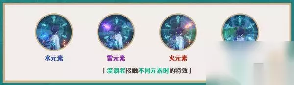 (固有1效果·上与特效·下) ①.接触多种元素时,触发增益效果的优先级为水、火、雷、冰。 ②.流浪者自身附着相关元素时也可以触发增益效果。