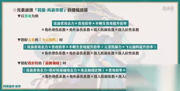 ▶「空居力」的性质 ①.空居力不属于体力,双风共鸣的体力无法减少消耗效果。 ②.浮空期间可以通过边普攻输出边移动的“走A”方式输出,冲刺更多是在固有天赋2(梦迹一风)效果可以触发时,或者规避敌人攻击时使用。 【伤害机制】元素战技增幅的结算 元素战技开启后对流浪者普攻、重击的增幅与宵宫类似(如下图): 【注】①.云堇的固有天赋2(莫从恒蹊)会根据队内元素类型数量进一步提高飞云旗阵的提升倍率,即“技能内的飞云旗阵提升倍率+固有2的提升倍率”。 ②.班尼特的1命会进一步追加20%的鼓舞领域的提升效果,即“技能内的攻击加成比例+20%”。