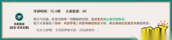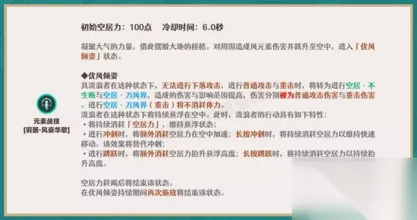 2.元素战技 【基础机制】 ①.施放战技后的浮空状态不改变普攻/重击的附着强度(仍为弱风),具有对空/对地的能力。 ②.元素战技的施放命中不产球,后续浮空期间的普攻命中敌人产生1颗风元素微粒,冷却时间为2秒。 ③.浮空期间的「空居力」将代替体力条,浮空期间已消耗的体力值仍可正常回复体力,在大世界探索中可以循环利用冲刺、战技浮空交替跑图。 ④.施放战技后点按/长按跳跃键可提高浮空高度,该效果多是在大世界探索中使用,在深渊战斗中初始浮空高度即可。 ⑤.元素战技属于增益类技能,浮空期间的攻击仍然属于普攻/重击范畴,不属于元素战技,该效果与「宵宫」的元素战技类似。