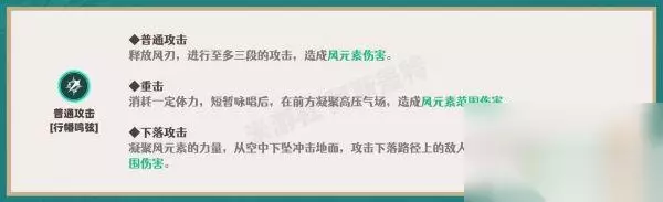 1.普攻 ①.普攻为向前挥出风刃,射程较远,共3段4次攻击,重击具有范围伤害能力。 ②.普通攻击遵循“命中同一敌人时2.5秒内每2次攻击产生元素附着”的规则,每次重击均能产生元素效果,均为弱风元素。