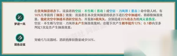③.接触冰、火元素产生的增益效果会显示在流浪者的角色面板上。 ④.当浮空状态结束后,所获得的增益效果将会消失,再次施放需要重新接触元素。 ▶ 固有天赋2&3 ①.天赋2的伤害类型不属于普攻、重击、下落攻击、元素战技和元素爆发的任意一类,为无类型的风伤攻击。这也意味着无法获得以上对该五种伤害类型的伤害提升。 ②.当天赋允许触发时无需消耗体力即可冲刺,但更多作为规避敌方攻击,而无需可以触发。 冲刺时虽然无额外消耗,但是仍存在空居力的自然消耗,在不规避敌人技能时进行普攻输出的伤害更高。