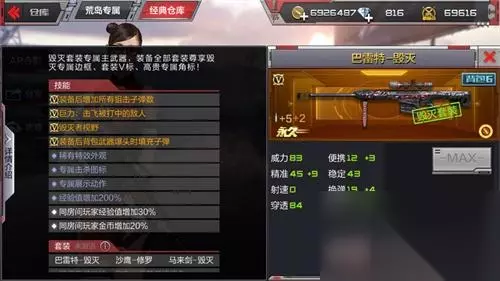 永久英雄级武器毁灭者视野开镜特制的炫酷外观平衡游戏内属性作为CF的永久英雄级武器,介绍中的四大属性中除了"永久"这一英雄级武器均具有的武器属性外,炫酷的武器外观也就不用多提。只是在这里强调Barrett-毁灭独有的两条官方介绍到的属性“开镜毁灭者视野”&“平衡游戏内属性。