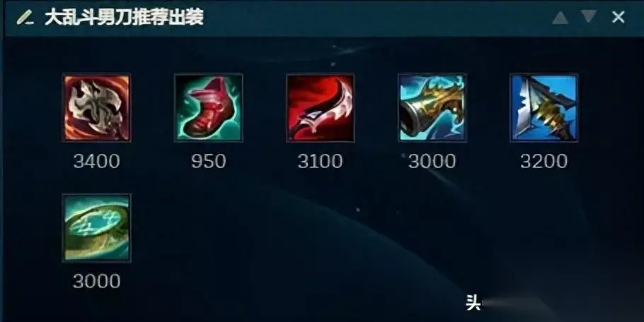 出装:贪欲九头蛇+暮刃+收集者+赛瑞尔达的怨恨+公理圆弧 加点:主W副Q,有大点大。 出装解析:贪欲九头蛇增加AOE伤害,配合W技能可快速清线。大量技能急速和生命偷取让男刀对拼更舒服。 自从暮刃增加技能伤害后,男刀在打脆皮的情况下一套技能伤害要高于星蚀。加上暮刃提供技能急速以及1.5秒不可被选取,让男刀有机会多打一套技能,所以暮刃比星蚀更优秀。 收集者提升男刀斩杀线,确保秒掉㿷 赛瑞尔达的怨恨赋予第一段W减速,提高二段W命中率。 公理圆弧有效减少大招CD,后期一波团战两个大招轻轻松松。 上述装备大都提供技能急速,使得男刀技能CD非常短,带征服者打架很强,所以我才说男刀大乱斗定位更像战士而不是刺客。 玩法简介 出门装“守护者之刃+眼泪”,眼泪后期可以卖掉。学一级Q两级W,千万不要顺手把QWE各点一级。 大乱斗男刀胜率低的原因不仅仅是熟练度不够,更多的是进场时机把握能力不强。 很多新手男刀看到有人走到技能范围能就冲上去打一套,也不管自己有没有大招和队友位置。 这就导致冲上去打连被动伤害都没打出来就暴毙。 连续死几次装备跟不上秒不掉人打团又没伤害,自然而然就输掉对局。 大乱斗不像召唤师峡谷,打完一套旁边有墙体给你翻走。 如果大乱斗男刀进场秒不掉人暴毙的就是自己,而秒人关键就是打出被动伤害。 所以新手判断什么时候能进场打一套输出的最佳策略就是:看目标有没有被你两段W都打到。 当敌人被男刀两段W刮到时,后续只要接QA就能触发被动伤害,被集火再开R隐身后续看情况追击还是后撤。 当然,不是每波能都W两段刮到敌人,所以切后排连招为:雪球WQRA。 如果敌方阵容非常扎实摸不到后排,男刀也不要强行进场去切。征服者男刀就是战士打法,这时候能打到谁就打谁,只要被打的目标触发了男刀被动伤害,队友再补一点伤害就能将其解决。 总之,没事就躲在草丛里丢W,清兵的同时看看能不能两段W都打到人,打到就找机会QA打出被动伤害,打不到就当帮助队伍推线,掌握主动权。