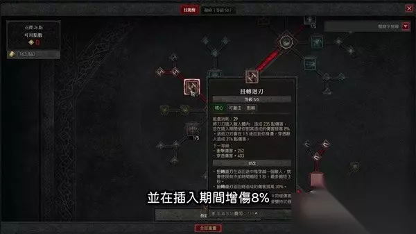 核心技能选择我们这个流派的主轴扭转回刃,扭转回刃的运作方式是,他会先将刀插在敌人体内造成一次伤害,并在插入期间增伤8%,1.5秒后刀会飞回玩家身边,对穿透的敌人包括一开始被你插的,再造成一次伤害,后续点上强化扭转回刃,来进一步提高返回的伤害,分叉选择进阶扭转回刃,这个天赋点很重要,它的效果是刀刃在返回的途中,每命中一名敌人,就可以减少所有技能的冷却一秒,最多减少3秒,操做得好的话,可以大大提升灌注类技能的覆盖率,还有大招的使用频率,非常的强悍。