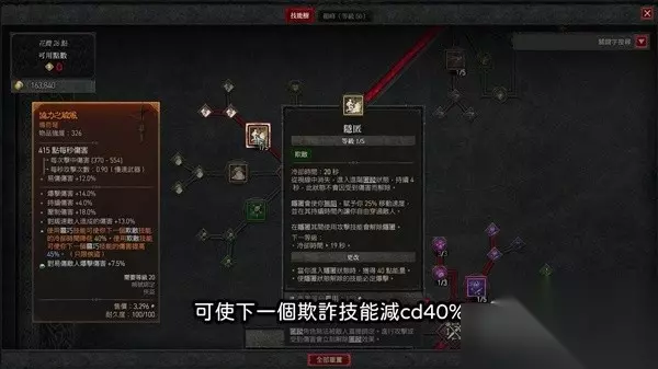 欺诈技能可以依自己的喜好,或是打到的橘装来做选择,也可以不用点数拿去点功勋,然后选自己喜欢的技能,像刚刚提到的双移动技,那我自己选了隐匿,因为我打到了这件橘装,使用灵巧技能可使下一个欺诈技能减cd40%,使用欺诈技能可使灵巧技能增伤45%,这件橘装配上刚刚讲的进阶扭转回刃,可以实现一直使用欺诈技能,像我就是可以一直隐形,隐匿在点完后续的小天赋点后,每次使用还可以拿到40点能量和一次必定爆击的机会,非常的强悍,当然配上其他的欺诈类技能也可以,各位可以自己试试看。