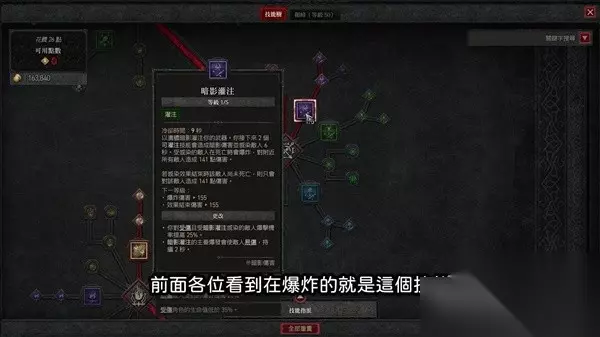 灌注技能选暗影灌注,前面各位看到在爆炸的就是这个技能,后续点上强化暗影灌注,对受伤且受暗影灌注影响的敌人,提高25%的爆击机率,和调和暗影灌注,主要爆发可以使敌人易伤2秒,接着把旁边的吞噬暗影点满,如果专精用看穿弱点,觉得自己不缺能量的话,也可以选精准灌注来提高爆击机率。