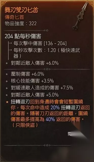 装备 主要推荐舞刃,扭转回刃回到身边时会短暂围绕你,每次命中造成20%扭转回刃返回的伤害,随着距离还会提高增伤,这个可以大大提高我们的伤害,并且各位想选其他灌注技能的话,强烈建议有他在选,虽然我没有很推荐,那一定有人会问我,没有这件橘装可以玩吗,我的回答是…还是可以就是比较弱,大可在没这件橘装的时候就在玩扭转回刃了,不过记得灌注技能要选暗影来清群怪会比较有效率。