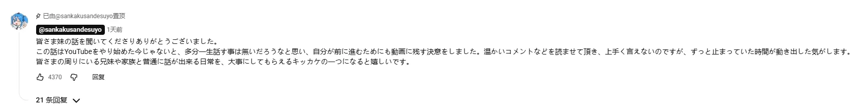 在视频的结尾,三角头老师说道:“小埋这个角色就是我的妹妹…希望大家不要忘记她。小埋也是她曾经活过的证明,如果没有我妹妹的话,小埋这个角色也不会存在。我想只要小埋永远不被大家遗忘,也代表着我妹妹会被大家一直记着。”视频下方,三角头老师也表示:“读着大家温暖的评论,我真的难以用语言表达,感觉时间仿佛静止了一般,又重新开始流动起来。我希望我的故事能激励你们珍惜日常生活中与兄弟姐妹和家人正常交流的时光。”