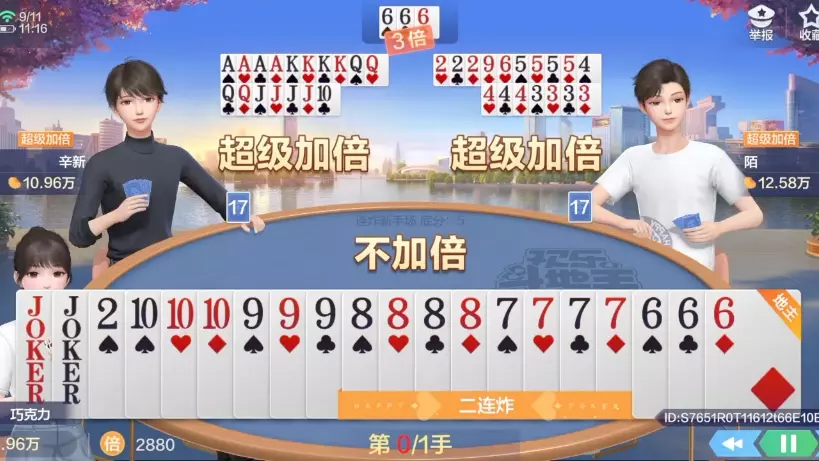 这是一则欢乐斗地主的趣味内容,展示了玩家拿到的超级整齐的牌型,玩家选择超级加倍,而另外两位玩家均选择不加倍,尽显打牌的气势,欢乐感拉满。