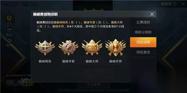 段位体系 巅峰赛段位由低到高依次分为四个大段位,分别是: 1.巅峰精英 2.巅峰专家 3.巅峰大师 4.巅峰宗师 每个大段位下又细分为三个小段位,具体排列如下: 巅峰精英Ⅰ → 巅峰精英Ⅱ → 巅峰精英Ⅲ 巅峰专家Ⅰ → 巅峰专家Ⅱ → 巅峰专家Ⅲ 巅峰大师Ⅰ → 巅峰大师Ⅱ → 巅峰大师Ⅲ 巅峰宗师Ⅰ → 巅峰宗师Ⅱ → 巅峰宗师Ⅲ