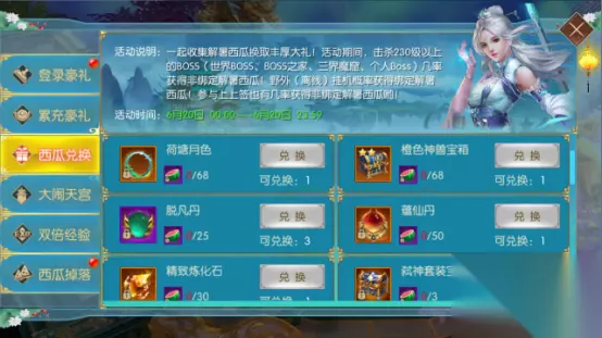累充豪礼 活动时间:活动仅维持6月22日当天,仅1天 活动说明:玩家累计充值到达一定额度,可获得精美时装、飞升灵丹、根骨保护符等豪礼礼包哦 西瓜兑换 活动时间:6月22日00:00至23:59 活动说明:一起收集解暑西瓜换取丰厚大礼!6月20日当天23:59点前击杀230级以上的BOSS(世界BOSS、BOSS之家、三界魔窟、个人BOSS)几率获得非绑定解暑西瓜!野外(离线)挂机概率获得绑定解暑西瓜!参与上上签也有几率获得非绑定解暑西瓜哟! 兑换奖励道具:可以获得精美相框和气泡、称号卡、精致炼化石、百变灵宠礼盒、弑神套装宝箱等丰厚道具