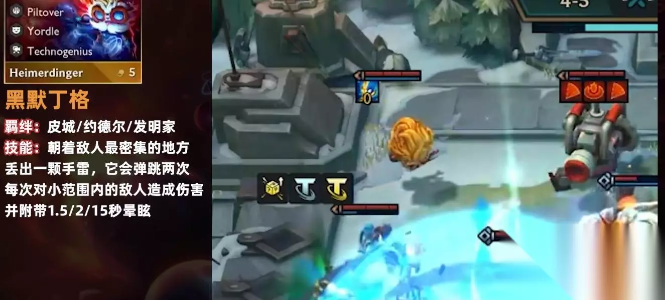 《云顶之弈》S9黑默丁格羁绊技能一览 S9赛季上线时间:2023年6月13日 黑默丁格 卡费:5 羁绊:皮城/约德尔/发明家 技能:朝着敌人最密集的地方丢出一颗手雷,它会弹跳两次,每次对小范围内的敌人造成伤害并附带1.5/2/15秒晕眩。