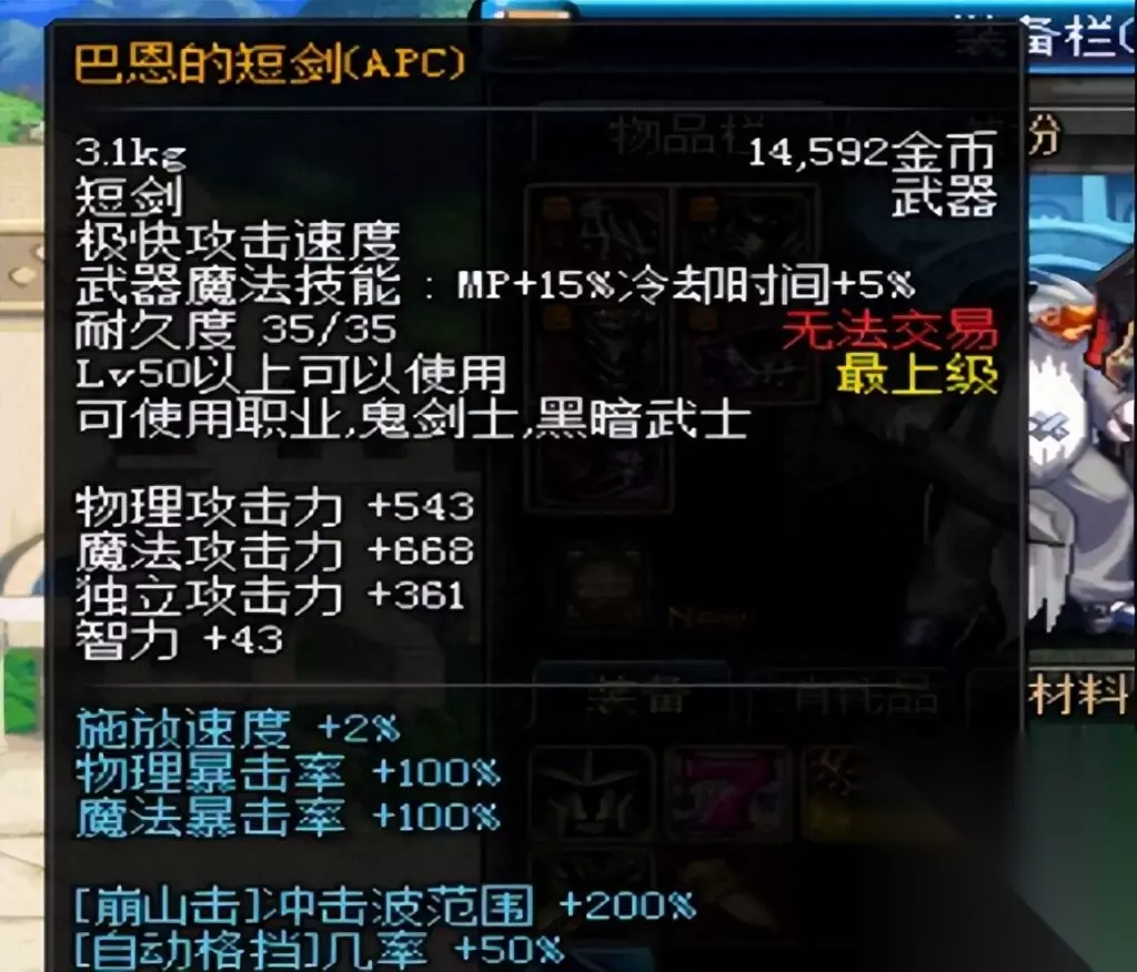 不过当这名玩家点开这把传说中的神秘武器一看,直接懵了,这武器的属性怎么和传说中的不一样啊。说好的增加100%暴击率呢,这武器竟然只是增加剑魂的一些技能属性,有几率出现巴恩的飓风而已。这属性虽然也不差,但是和传说中的那把武器比起来还是差了很多的。再仔细一看这武器的名字,这名玩家也是发现了不对劲的地方,这武器虽然也是巴恩的短剑,但却是多出了两个字,这是巴恩的飓风短剑啊。