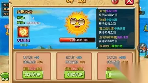 玩家到20级可开启此玩法,进入界面后,首先可随机选择出海船只种类。小竹筏呀、巡洋舰什么的。船的品质越高,获得的奖励越好。捕鱼开放时,玩家可以选择使用太阳许愿功能,通过许愿增加全服的太阳心情,若全服心情总量到达1000,就会触发“风和日丽”BUFF:航行速度提升40%,捕鱼奖励额外增加10%。