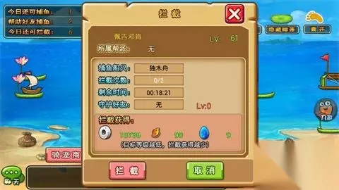 另外,此玩法还引进了PVP元素。玩家可以对海面上的任意船只进行拦截操作。拦截成功将会夺取捕鱼者的部分奖励。级低的玩家可能会抱怨:“这不是坑爹嘛,好不容易捞几个土鳖还要被土豪抢。”放心,玩家只能对于自己所在的等级段进行拦截,如果差距过大,是没有效果的。而且捕鱼系统还有一个护航功能,如果你有土豪朋友,邀请他为你护航,遭遇拦截时,土豪会为你跨刀相助哦。