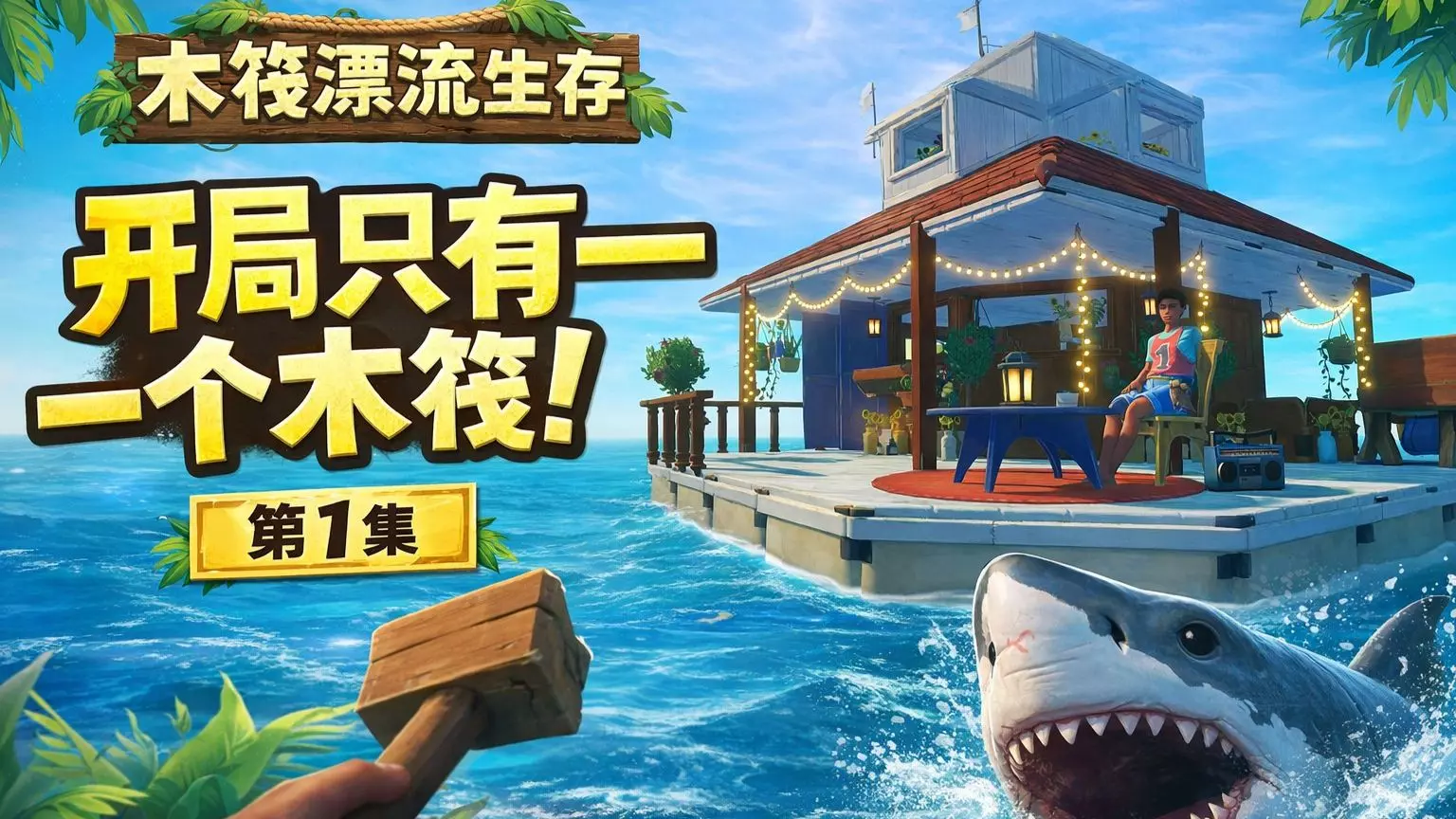 本期开始体验生存游戏《Raft(木筏求生)》 开局只有一块小木筏,在无尽的大海上漂流求生。 不断收集资源、扩建木筏,还要小心海里的鲨鱼!