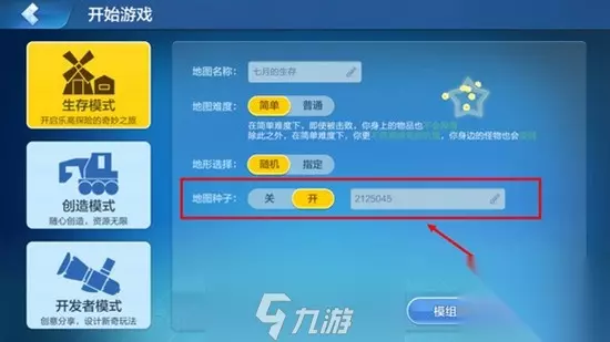 地形选择选择随机,地图种子选择开,将地图特征码输入 ,确定生成,我们就能获得对应的地形啦。