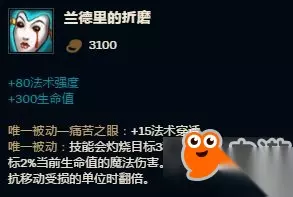 【无效之法球】和【玛莫提乌斯之噬】的作用都是放置AP爆发斩杀,条件都是生命值小于30%时触发。 420的基础护盾值,已经可以抵抗后期法师的一个小技能伤害了。 【无效之法球】的护盾加成是攻击力和法强,【饮魔刀】的加成是魔抗,各位可以在游戏中斟酌考虑,出合适的装备增加护盾值。 6、【焦灼】+【兰德里的折磨】——持续伤害让敌人头痛不已