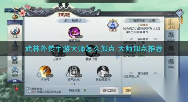 武林外传手游天师怎么加点?武林外传手游中玩家玩术士需要转职后,可以从三个职业中选择一个,天师就是术士的转职职业之一,这个职业擅长大范围群攻技能,刷怪速度很快。玩家如果想要转职为天师,可以先来看看天师加点推荐内容。
