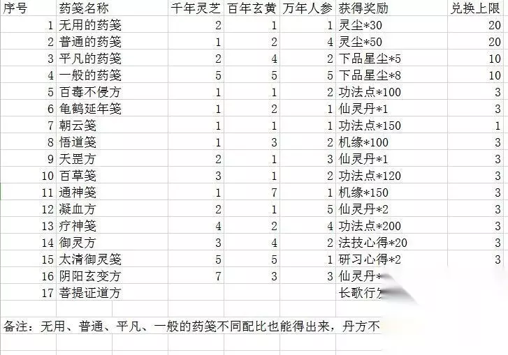 相助长歌炼药配方汇总: 111 朝云 112百毒 121龟鹤 312百草 211无用 241普通 132悟道 171通神 213天罡 342御灵 215凝血 424疗神 234平凡 733阴阳