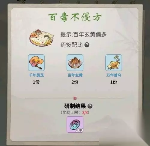 一念逍遥药方配比大全 20天罡木可以铸造本命法宝(第一个材料秘境就能获得)目前获得途径:坊市购买种子(3格24小时成熟)、天机阁购买、周活跃、本命玉简、古修商店兑换 198礼包15个天罡木1800个七星,充值不达到上限的,是没有这礼包的; 心疼的阿诗勒隼只能委托各位仙友,解救长歌,友需要寻找丹方,炼丹救人,但丹方并不唯一,需要仙友研制出每种丹方,解救长歌。 温馨提示,每种丹方只有一个可成功研制的材料配比,不过仙友也不用太担心自己的运气,炼制达到一定次数后,可随机获得一个未解锁的药签配比提示,最多有4次提示机会。