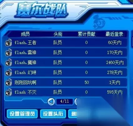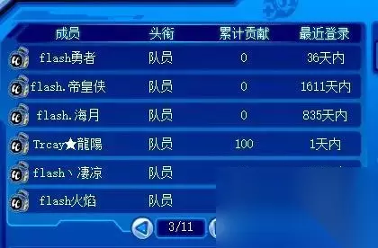 记得以前还有战队精灵,就是打要塞保卫战换的精灵。当时我是我们队的队长,每次打的时候我都一直吆喝队员“先打总部”,因为当时的机制是要塞攻下来就算胜利。当时在我的带领下,几乎把把赢。可是,现在我当时的队员都不再回来了,前几天把战队成员清理了一下,把那些不再回来的都“开除”了,很痛心吧,哎~ 这是清理过后现存最长时间不登录的队员了,实在不舍得再删了,就留下了。 我记得当时都习惯起名Forever.XX,我为了让我们的战队与众不同,就起了flash.XX,然后我的队员都很支持。