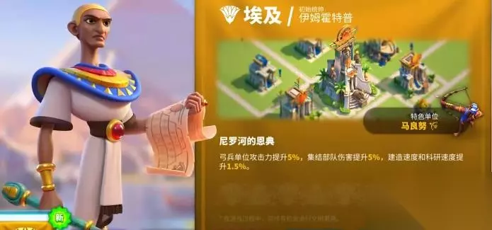 三星后会解锁三技能医神的庇护,当驻扎自己城市的时候,就会让率领部队的生命值提升百分之七。驻防的时候使用会让我方的生存能力增加,但是实战过程中的用处比较小。四技能和平的贤者就是在率领部队受到攻击时,有百分之十的概率会对敌方目标部队施加持续三秒的减益效果。效果是让其技能伤害降低百分之五,每隔五秒钟就会触发一次。该武将来自于埃及,拥有尼罗河的恩典天赋加成,会让弓兵单位的攻击力与集结部队伤害提升百分之五,建造速度与科研速度都提升百分之一点五。