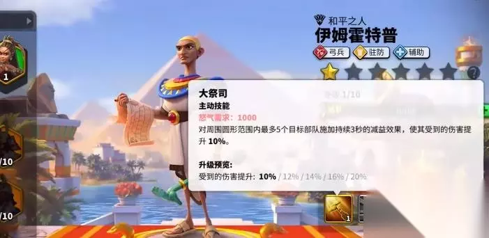 伊姆霍特普是定位为驻防与辅助的弓兵型武将,碎片的主要入手方式就是酒馆、埃及初始武将活动等。主动怒气技能为大祭司,所需要的怒气值是一千点。效果是对周围圆形范围内最多五个目标的部队,施加会持续三秒钟的减益效果,使其受到我们的伤害会直接提高百分之二十。这是个非常典型的辅助技能,对于自身的收益没有特别大,主要就是让攻击型队友打出更高伤害。