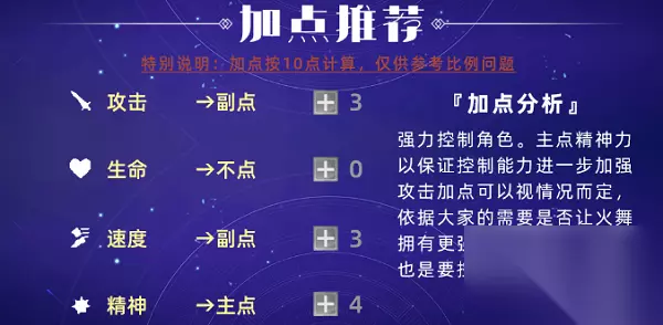 『加点分析』 强力控制角色。主点精神力以保证控制能力进一步加强攻击加点可以视情况而定,依据大家的需要是否让火舞拥有更强的攻击能力。速度也是要制在适当的位置。