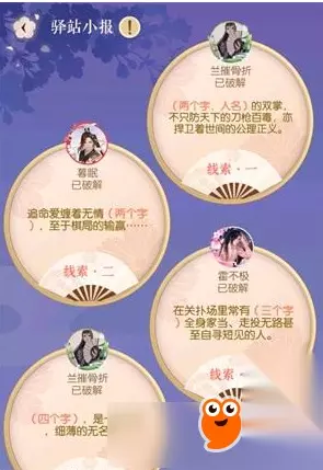 遇见逆水寒驿站小报12月9日谜题答案是什么,遇见逆水寒驿站小报往期答案大全在哪查询,想知道在哪查看每日一题答案的话,不妨下面了解下233乐园小编带来的wiki新内容吧。 【驿站小报12月9日答案】 1.无情 2.爱吃 3.城东 4.梅花 往期答案一览: 12月8日 无情 / 方应看 / 打赌 / 学猫叫 12月7日 温柔 / 冬至 / 出道 / 走花路 12月6日 铁手 / 偷灯油 / 甩锅 / 糖球 12月5日 戚少商 / 翻墙 / 去神侯府 / 吸猫 12月4日 铁手 / 偷灯油 / 甩锅 / 糖球 12月3日 叶问舟 / 西湖 / 划船 / 沉船 12月2日 生活 / 不易 / 彭尖 / 叹息 12月1日 生活 / 不易 / 彭尖 / 叹息 11月30日 恭喜 / 苏梦枕 / 获得 / 大锤 11月29日 李师师 / 姬蜜儿 / 同游 / 金明池 11月28日 狄飞惊 / 喝茶 / 不吐 / 茶叶 11月27日 温柔 / 醉后 / 甜水巷 / 蹴鞠 11月26日 恭喜/苏梦枕/获得/大锤 11月25日 花将离 / 为吃 / 大闸蟹 / 摘下面具 11月24日 方应看 / 拥有 / 一池塘 / 河豚 11月23日 李师师 / 制作 / 伞 / 送人 11月22日 叶问舟是/三清山/烧烤/大师 11月21日 生活 / 不易 / 彭尖 / 叹息 11月20日 无情 / 方应看 / 打赌 / 学猫叫 11月19日 铁手 / 偷灯油 / 甩锅 / 糖球 11月18日 李师师 / 制作 / 伞 / 送人 11月17日 叶雪青 / 李师师 / 一起 / 打雪仗 11月16日 燕无归 / 晚上 / 睡觉 / 不闭眼 11月15日 顾惜朝 / 遇见 / 叶问舟 / 打雪仗 11月14日 苏梦枕 / 姬蜜儿 / 冷战 / 十年 11月13日 温柔 / 醉后 / 甜水巷 / 蹴鞠 11月12日 顾惜朝 / 在虹桥 / 拾到 / 秘戏图 11月11日 无情 / 深夜 / 看卷宗 / 不秃头 11月10日 阿呜 / 咬 / 糖球 / 尾巴 11月9日 铁手 / 吃 / 唐铸 / 豆腐 11月8日 铁手 / 下棋 / 输掉了 / 冷血的剑 11月7日 梁婆娘 / 唐铸 / 虹桥 /相会 11月6日 无情 / 深夜 / 看卷宗 / 不秃头 11月5日 姬蜜儿 / 私下里 / 不喜欢 / 吃豆腐 11月4日 彭尖 / 没有 / 想成为 / 药人 11月3日 顾惜朝 / 遇见 / 叶问舟 / 打雪仗 11月2日 红泪 / 十分 / 嫌弃 / 芫荽 11月1日 无情 / 方应看 / 打赌 / 学猫叫 10月31日 顾惜朝 / 遇见 / 叶问舟 / 打雪仗 10月30日 彭尖 / 没有 / 想成为 / 药人 10月29日 李师师 / 姬蜜儿 / 同游 / 金明池 10月28日 无情 / 投壶 / 赢得 / 金丝楠木 10月27日 李师师 / 制作 / 伞 / 送人 10月26日 花将离 / 关七 / 相约 / 吃瓜 10月25日 李师师 / 制作 / 伞 / 送人 10月24日 彭尖 / 想成为 / 赫连春水 / 的药人 10月23日 顾惜朝 / 用烧火棍 / 给自己 / 烫头 10月22日 苏梦枕 / 姬蜜儿 / 冷战 / 十年 10月21日 苏梦枕 / 暗恋 / 关七 / 很久了 10月20日 顾惜朝 / 遇见 / 叶问舟 / 打雪仗 10月19日 燕无归 / 晚上 / 睡觉 / 不闭眼 10月18日 铁手 / 吃 / 唐铸 / 豆腐 10月17日 李师师 / 姬蜜儿 / 同游 / 金明池 10月16日 阿呜 / 咬 / 糖球 / 尾巴 10月15日 燕无归 / 笔落惊风雨 / 题名 / 状元 10月14日 方应看 / 拥有 / 一池塘 / 河豚 10月13日 戚少商 / 抱怨 / 唐铸 / 能吃 10月12日 叶雪青 李师师 一起 打雪仗 10月11日 花将离 / 关七 / 相约 / 吃瓜 10月10日 彭尖 / 没有 / 想成为 / 药人 10月9日 花将离关七相约吃瓜 10月8日 彭尖没有想成为药人 10月7日 彭尖/想成为/赫连春水/的药人 10月6日 燕无归 / 笔落惊风雨 / 题名 / 状元 10月5日 燕无归/花将离/深夜/讲鬼故事 10月4日 铁手/下棋/输掉了/冷血的剑 10月3日 铁手偷灯油甩锅糖球 10月2日 姬蜜儿/私下里/不喜欢/吃豆腐 10月1日 燕无归/花将离/深夜/讲鬼故事 9月30日 铁手/吃/唐铸/豆腐 9月29日 花将离/关七/相约/吃瓜 9月28日 倾城佳人方应看一舞动京城 9月27日 倾城/佳人/方应看/一舞动京城 9月26日 倾城/佳人/方应看/一舞动京城 9月25日 顾惜朝/遇见/叶问舟/打雪仗 9月24日 方应看/在花朝节/艳压/关七 9月23日 顾惜朝/在虹桥/拾到/秘戏图 9月22日 顾惜朝/遇见/叶问舟/打雪仗 9月21日 叶问舟是/三清山/烧烤/大师 9月20日 梁婆娘/唐铸/虹桥/相会 9月19日 燕无归/喜欢/冬天/吃火锅 9月18日 花将离/关七/相约/吃瓜 9月17日 顾惜朝/遇见/叶问舟/打雪仗 9月16日 叶问舟是/三清山/烧烤/大师 9月15日 彭尖/想成为/赫连春水/的药人 9月14日 戚少商/抱怨/唐铸/能吃 9月13日 铁手/下棋/输掉了/冷血的剑 9月12日 顾惜朝/在虹桥/拾到/秘戏图 9月11日 彭尖/想成为/赫连春水/的药人 9月10日 无情/投壶/赢得/金丝楠木 9月9日 无情 / 投壶 / 赢得 / 金丝楠木 9月8日 叶问舟是/三清山/烧烤/大师 9月7日 铁手/下棋/输掉了/冷血的剑 9月6日 苏梦枕/姬蜜儿/冷战/十年 9月5日 花将离/关七/相约/吃瓜 9月4日 苏梦枕/暗恋/关七/很久了 9月3日 戚少商/抱怨/唐铸/能吃 9月2日 叶雪青/李师师/一起/打雪仗 9月1日 叶雪青/李师师/一起/打雪仗 8月31日 恭喜/苏梦枕/获得/大锤 8月30日 花将离/关七/相约/吃瓜 8月29日 花将离/关七/相约/吃瓜 8月28日 彭尖 / 想成为 / 赫连春水 / 的药人 8月27日 戚少商 / 抱怨 / 唐铸 / 能吃 8月26日 燕无归/喜欢/冬天/吃火锅 8月25日 苏梦枕 / 暗恋 / 关七 / 很久了 8月24日 铁手 / 下棋 / 输掉了 / 冷血的剑 8月23日 顾惜朝 / 遇见 / 叶问舟 / 打雪仗 8月22日 彭尖 / 想成为 / 赫连春水 / 的药人 8月21日 苏梦枕 / 姬蜜儿 / 冷战 / 十年 8月20日 花将离 / 关七 / 相约 / 吃瓜 8月19日 李师师 / 姬蜜儿 / 同游 / 金明池 8月18日 苏梦枕 / 暗恋 / 关七 / 很久了 8月17日 李师师 / 姬蜜儿 / 同游 / 金明池 8月16日 顾惜朝 / 遇见 / 叶问舟 / 打雪仗 8月15日 彭尖 / 想成为 / 赫连春水 / 的药人 8月14日 『 息红泪 / 十分 / 嫌弃 / 芫荽yán,suī』 8月13日 方应看 / 在花朝节 / 艳压 /