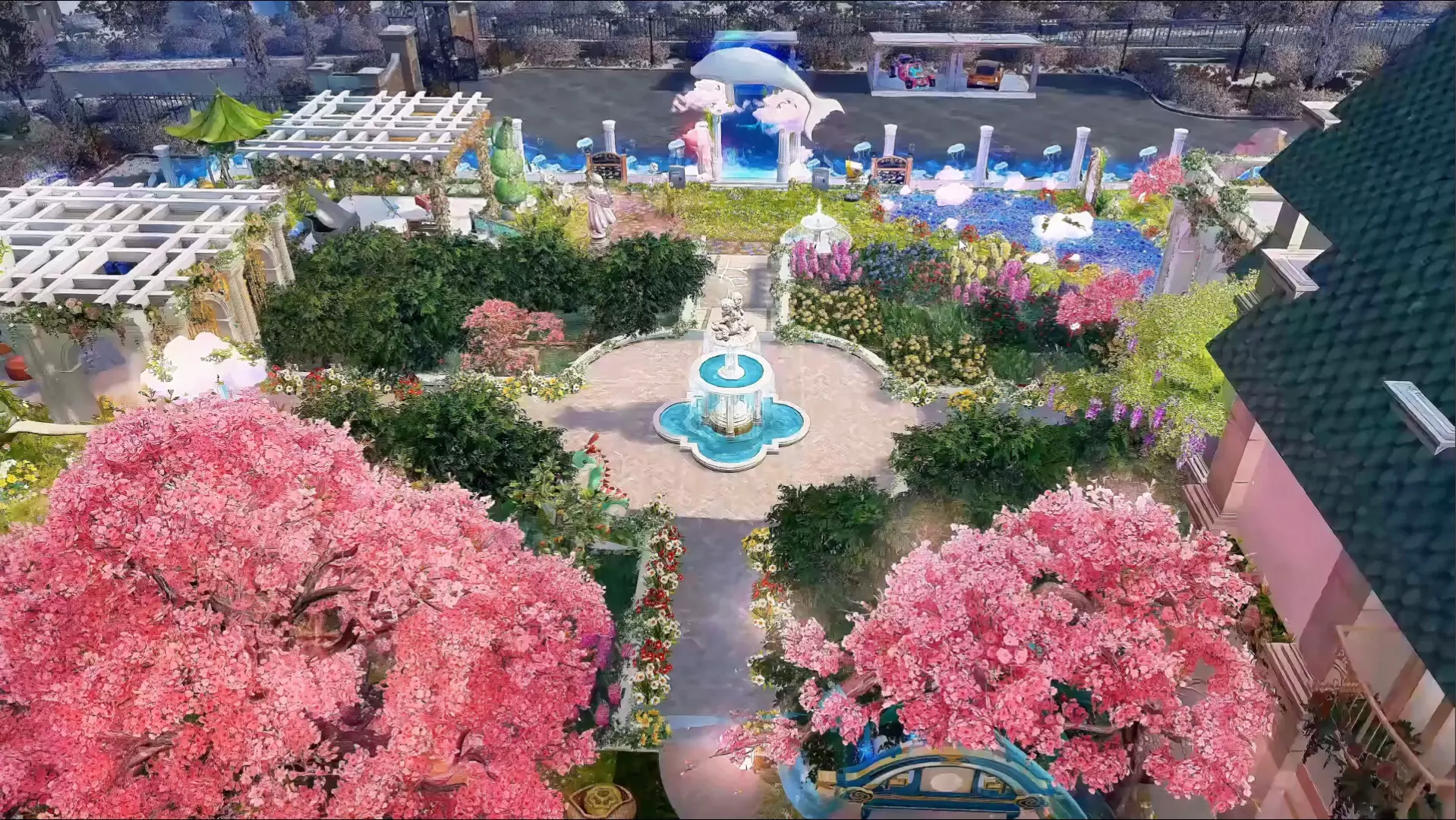 这是一款适合种植养殖的美式庄园游戏建筑,零氪即可搭建。庄园内中心喷泉四周可布置60个农田,还有专门的养殖区,房屋内部空间不大,整体兼具美观与种植养殖实用性。