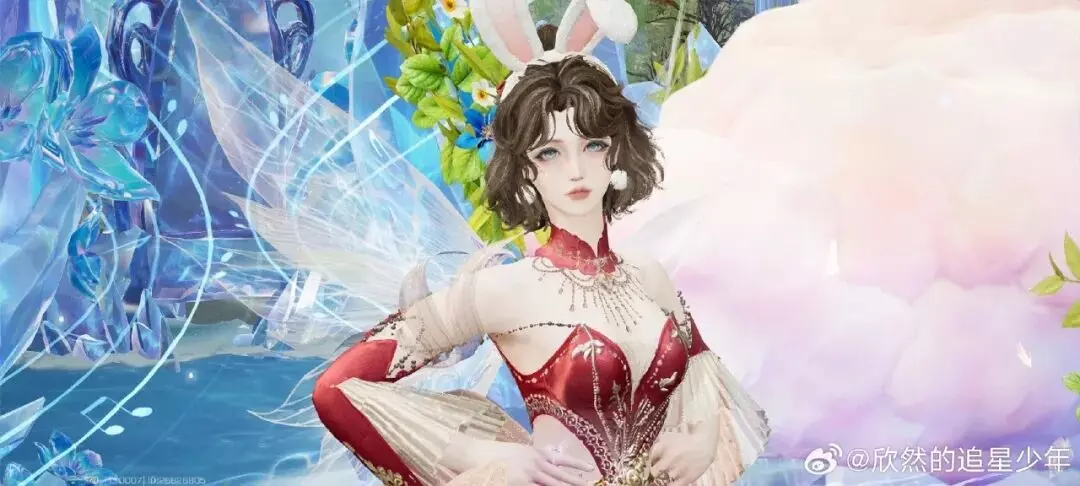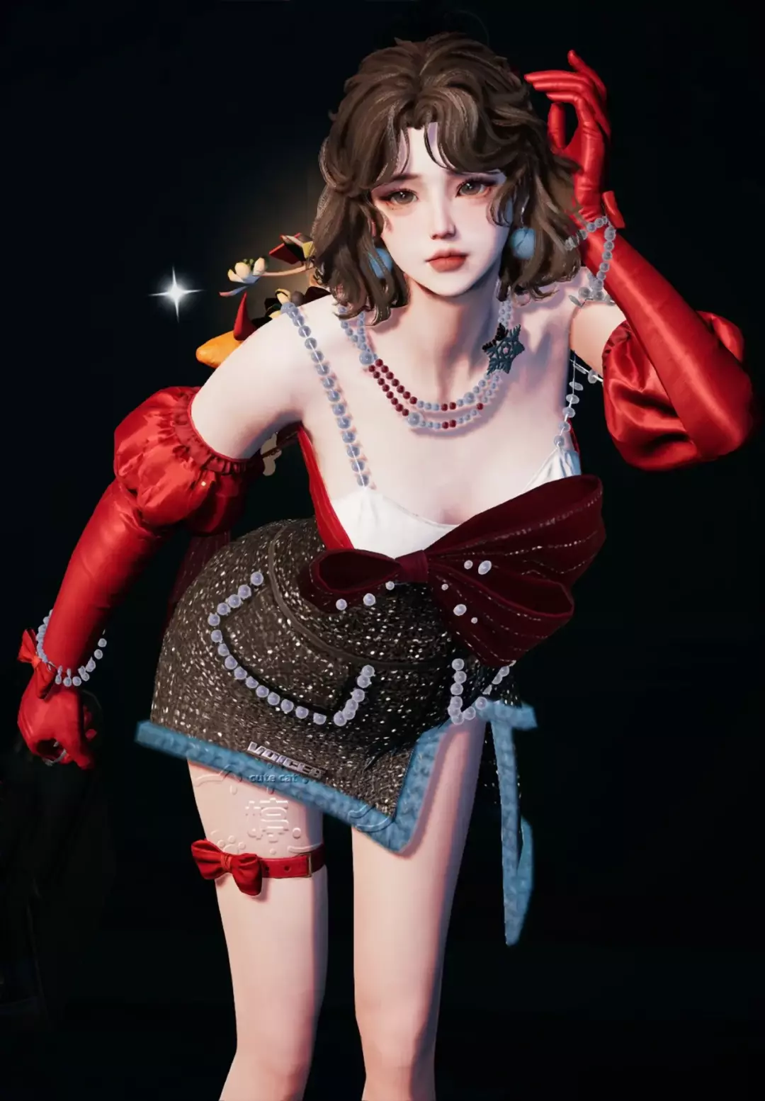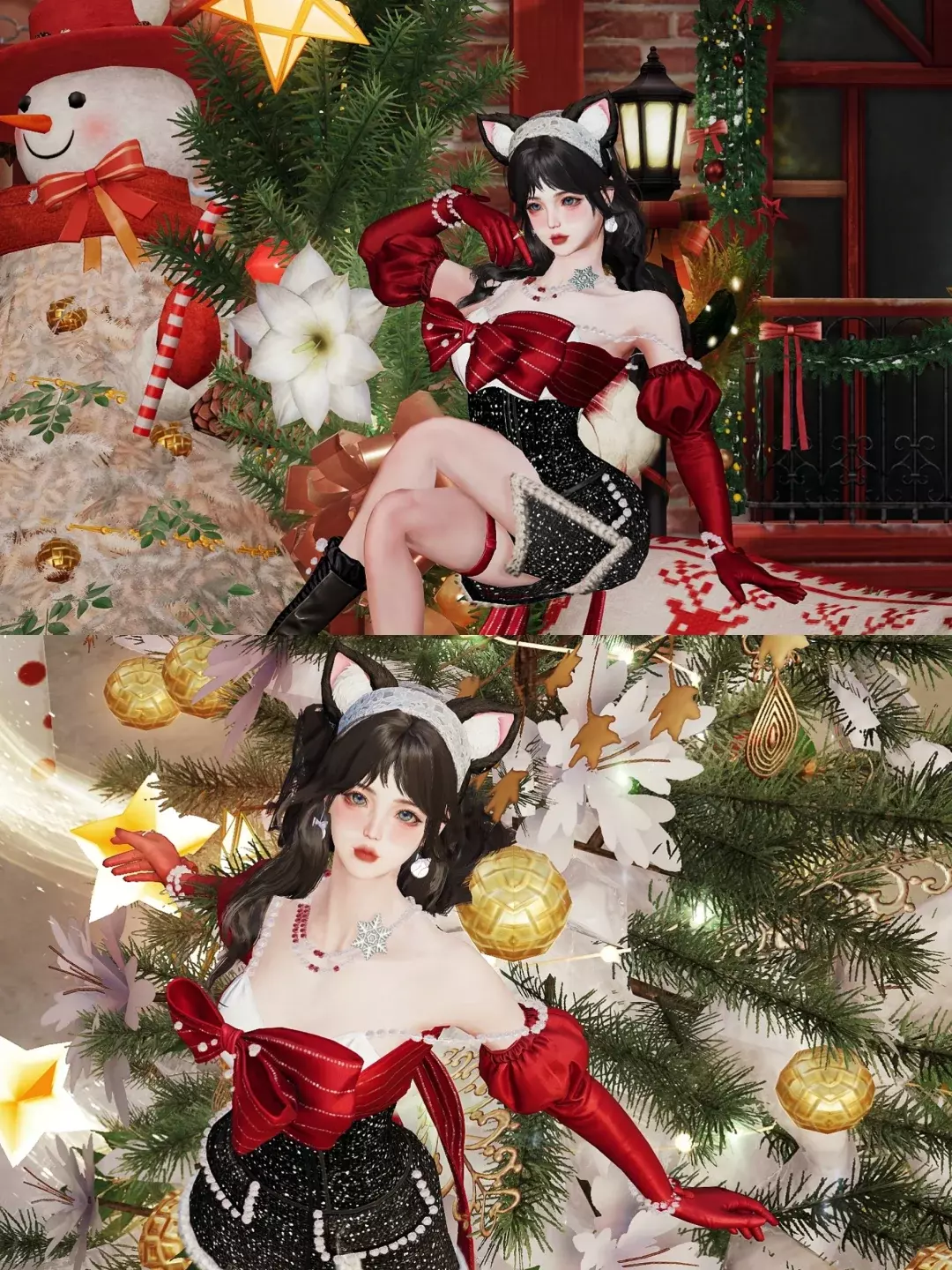 雪白耳尖与红黑礼裙形成甜魅反差