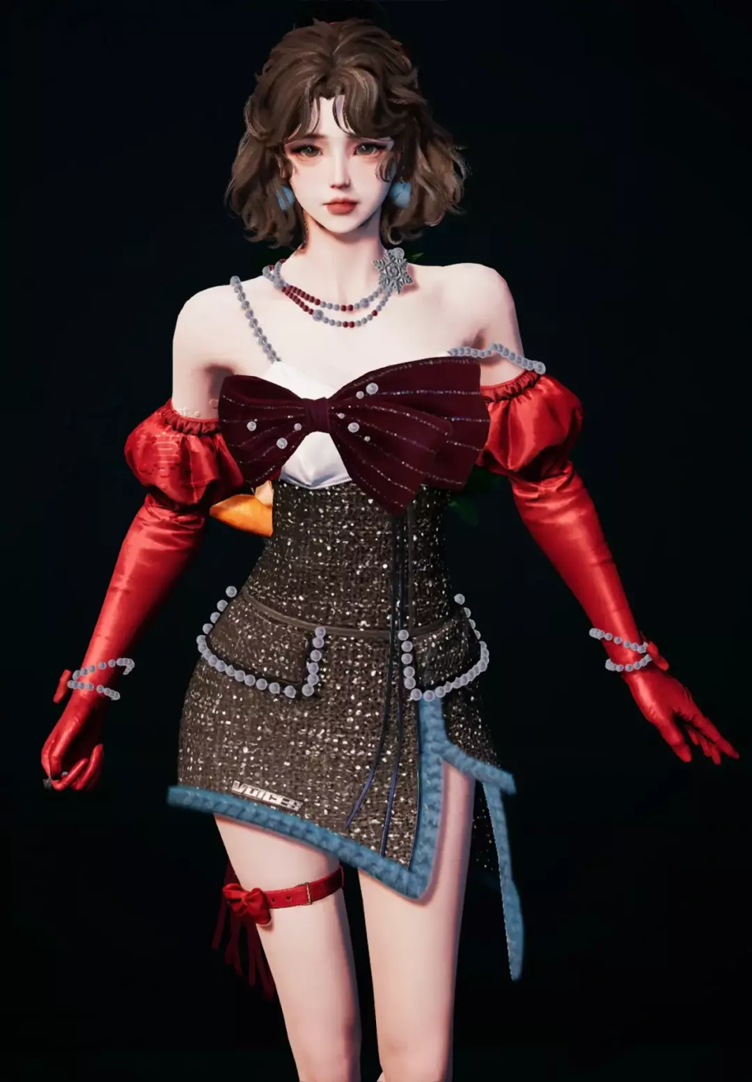 她身披酒红礼裙,胸前缎带与珍珠层叠